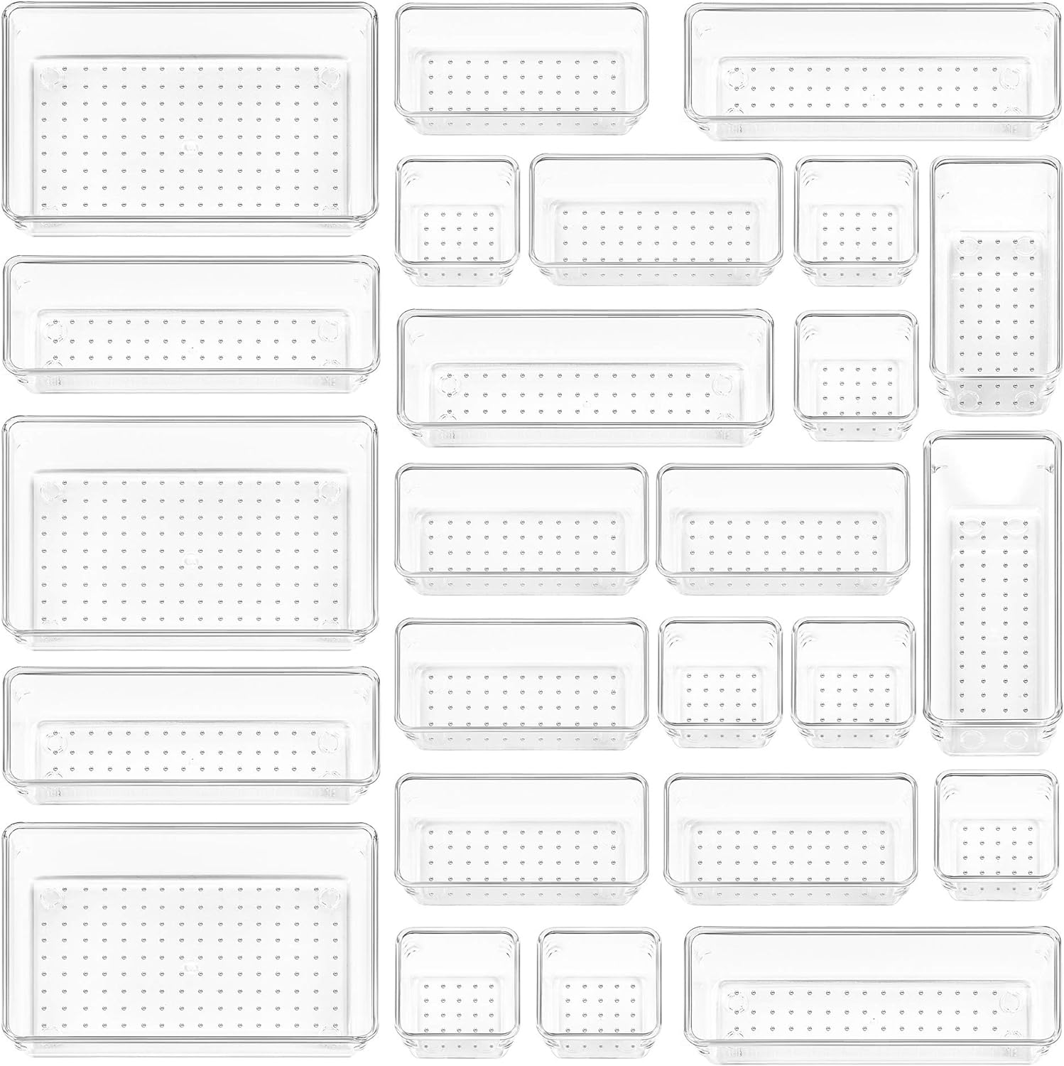 Vtopmart 25 PCS Clear Plastic Drawer Organizers Set, 4-Size Versatile Bathroom and Vanity Drawer Organizer Trays, Storage Bins for Makeup, Bedroom, Kitchen Gadgets Utensils and Office